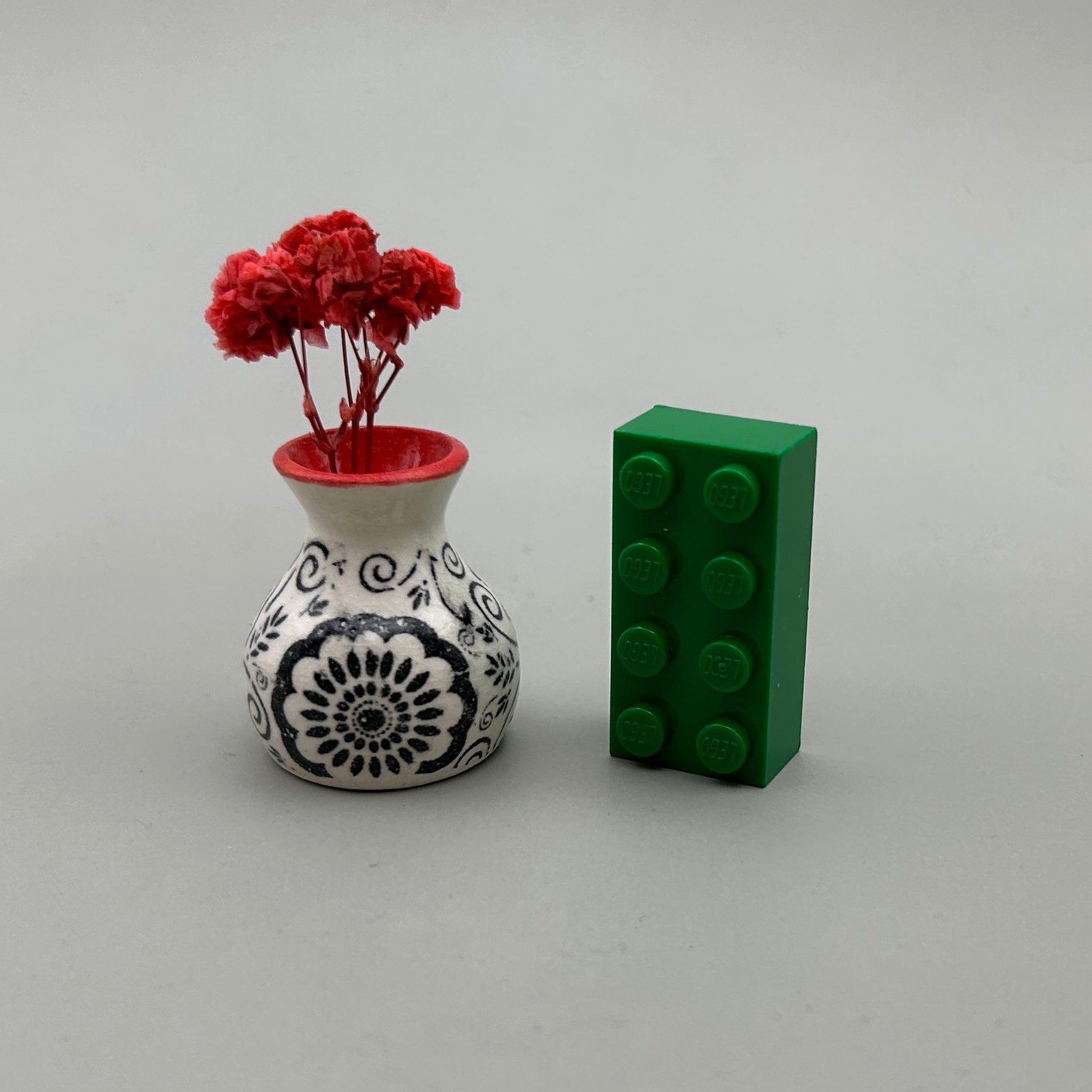 This handmade, whimsical tiny ceramic vase stands at about 1.25 inches tall and comes in clear glaze over a fun black floral design with a red lip.